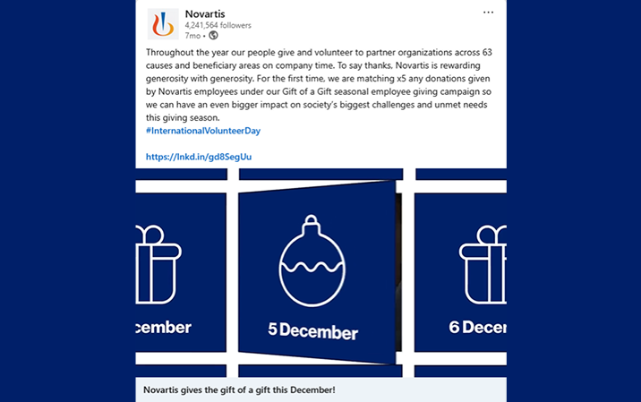 Novartis wanted to increase awareness of its Giving, Matching, and Volunteering program during the busy end-of-year period—while also motivating employees to actively participate. The challenge was to cut through seasonal noise with something that felt rewarding and human and clearly communicated the real impact of employee contributions.