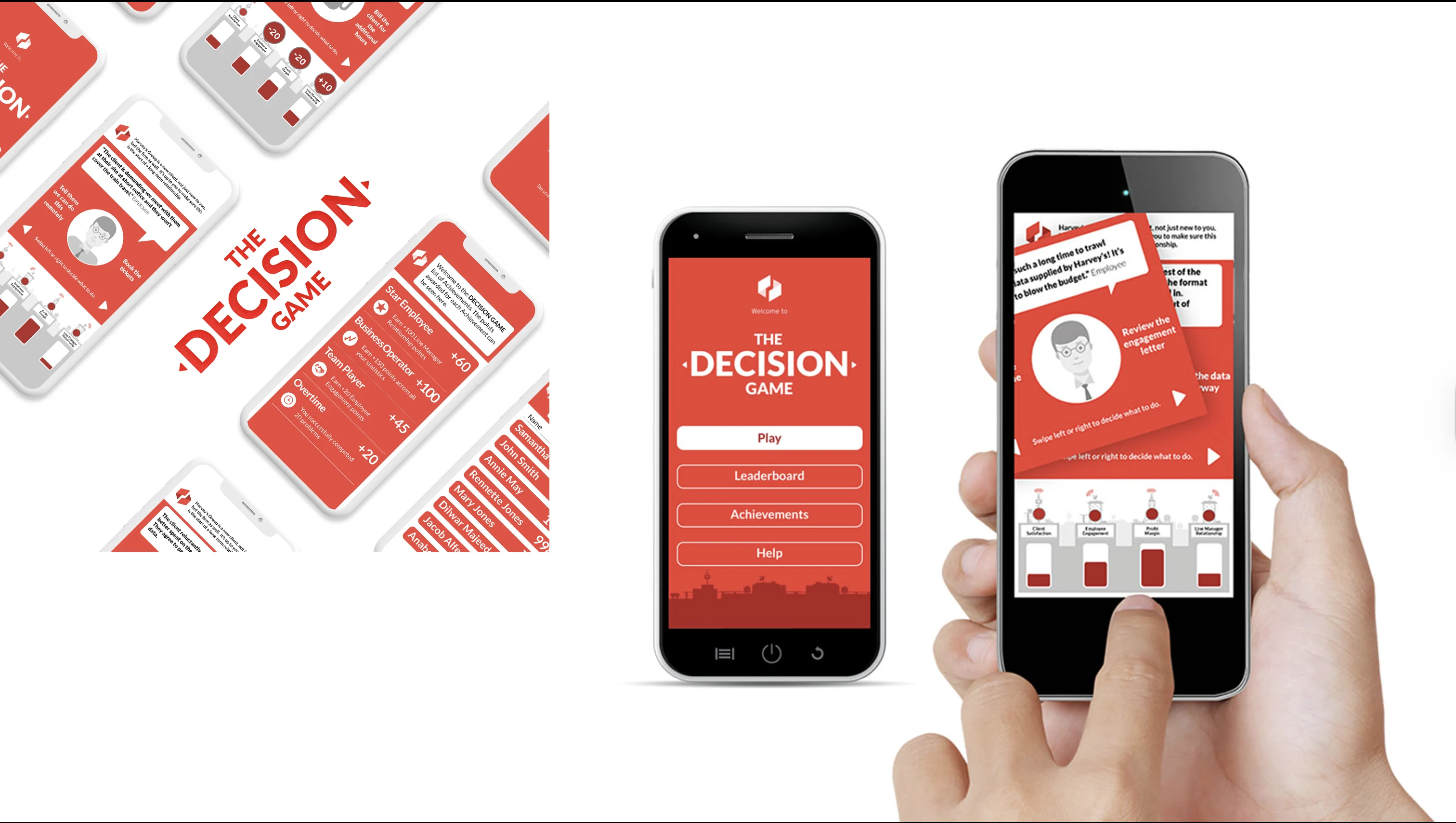 Ludic Media Studio designed and delivered a mobile-first Decision Game built around fictional business and project scenarios. Players are presented with immediate problems or questions from characters such as line managers, team members, clients, or contractors, and must make a decision by swiping left or right. Each decision has consequences, directly impacting a set of success KPIs including client relationship, revenue, project morale, and solution quality. Participants progress through levels, aiming to achieve the highest blended scores. All decisions are tracked, enabling deep analytics into engagement and capability focus areas, while a points system and leaderboard introduce light competition between users.